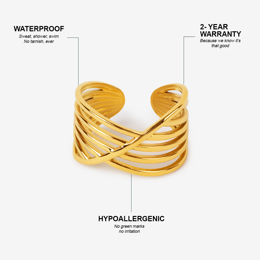 The small detail that changes everything. A gold ring designed to be noticed without trying. The piece stylists call "the unexpected finishing touch."