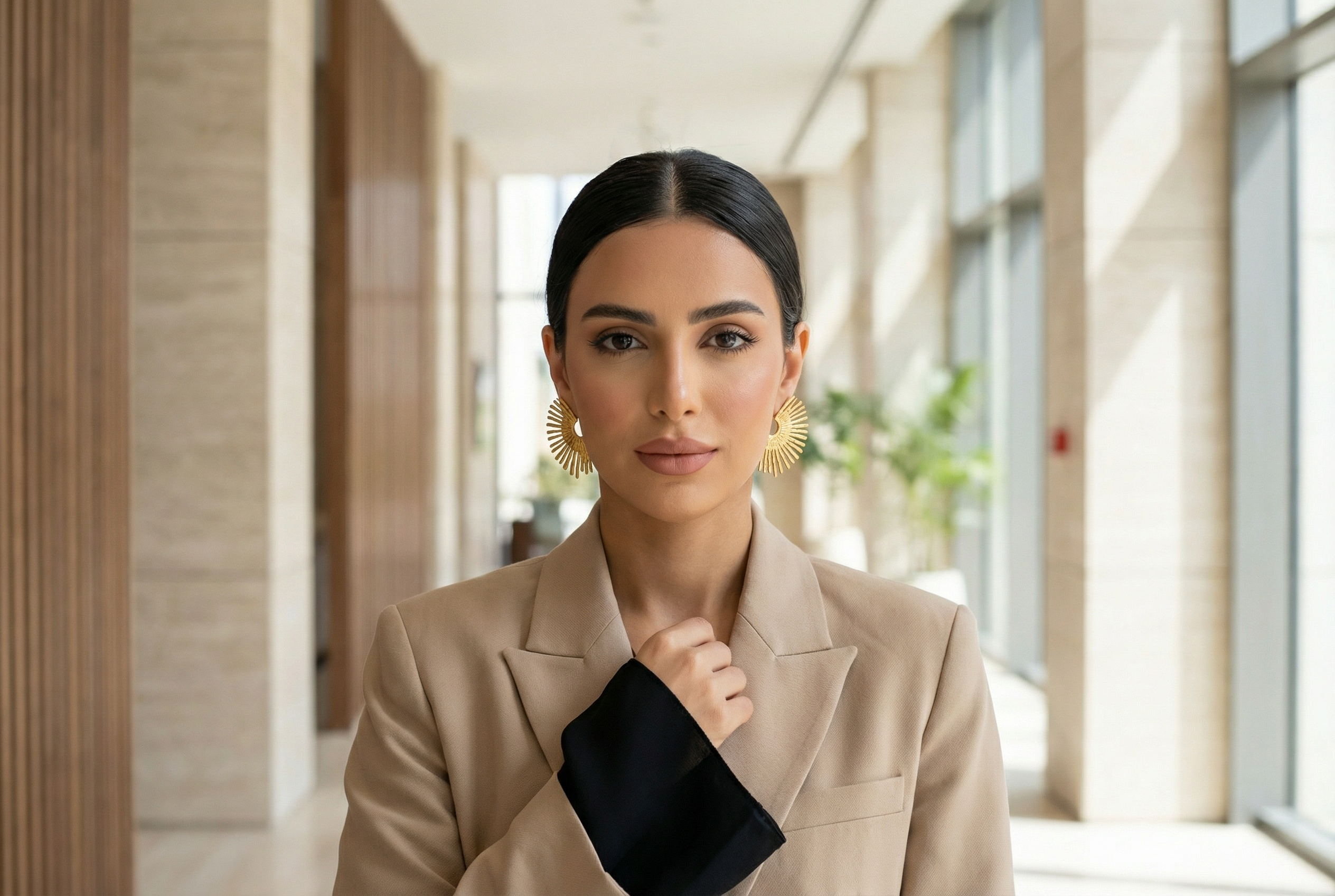 Hair up, crisp tailoring sunray earrings brighten meetings without
